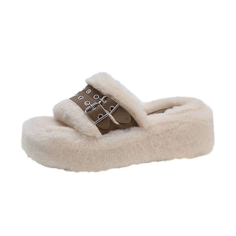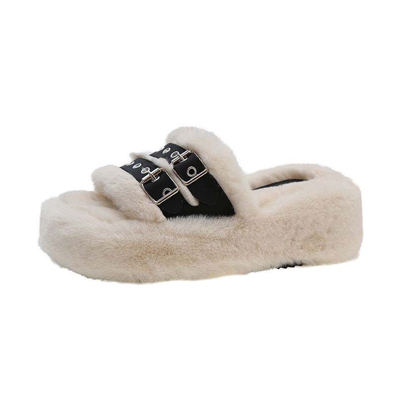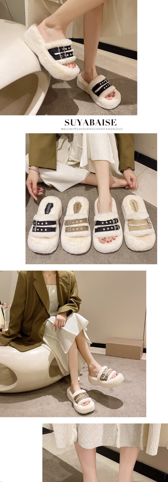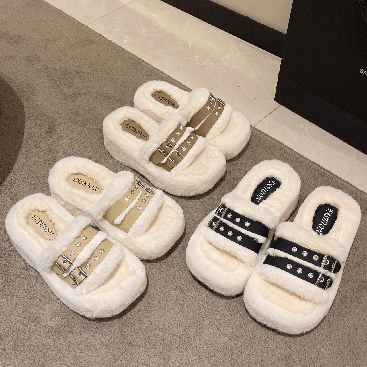Fluffy Wedge Slippers With Thick Soles 2023 Women's Casual Indoor Shoes Winter Warm Belt Buckle White Slippers