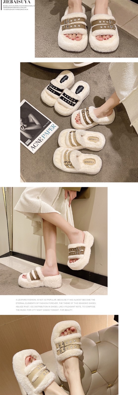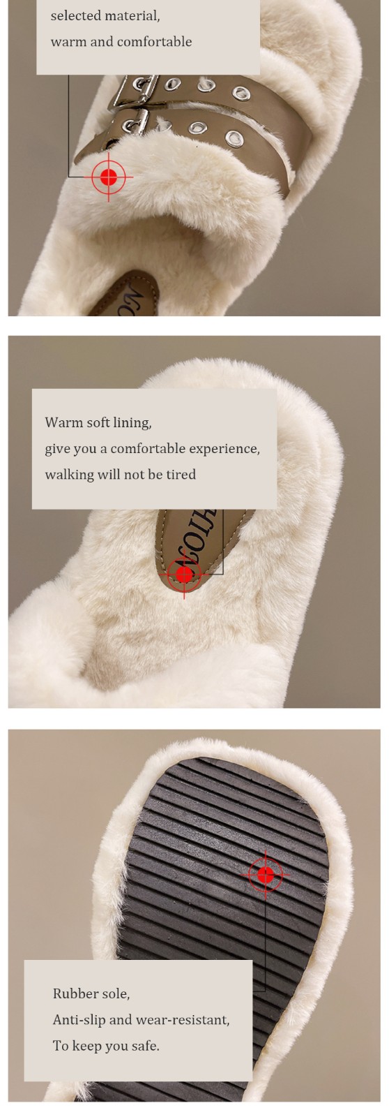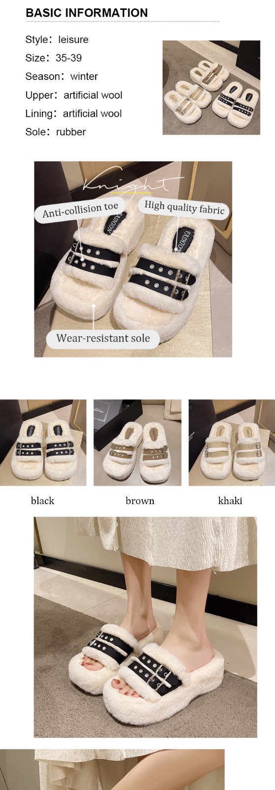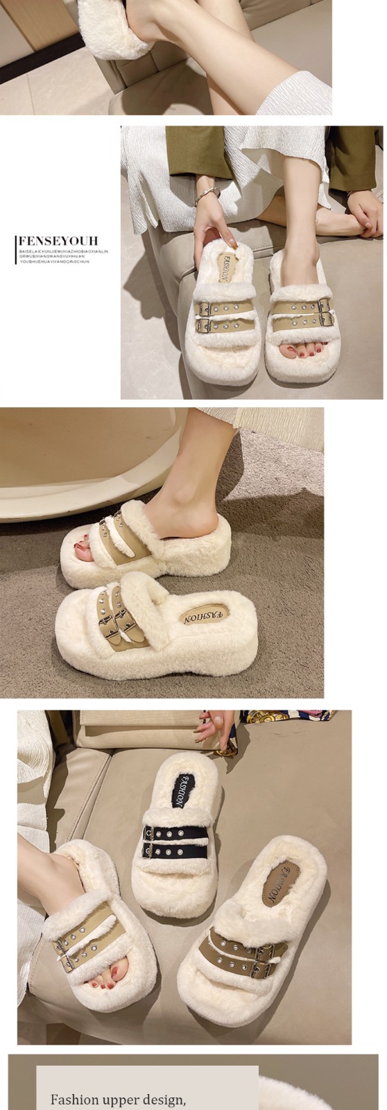 Fluffy Wedge Slippers With Thick Soles 2023 Women's Casual Indoor Shoes Winter Warm Belt Buckle White Slippers