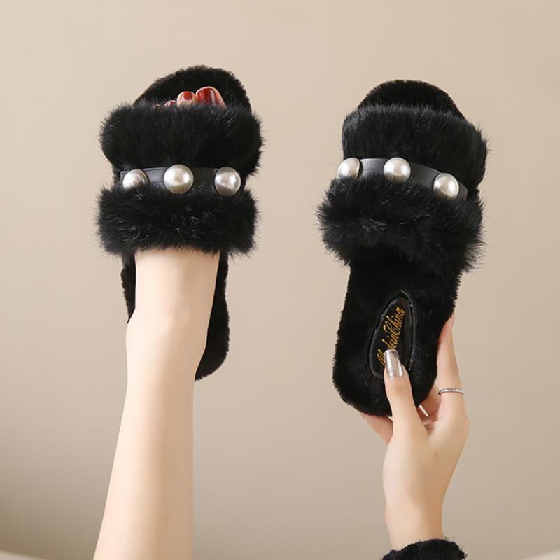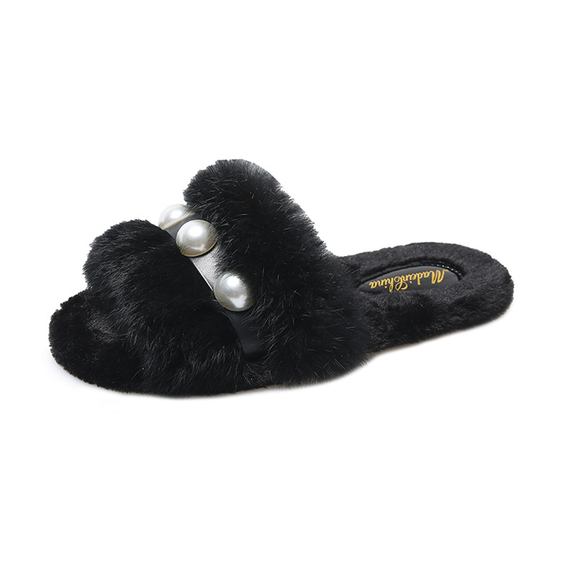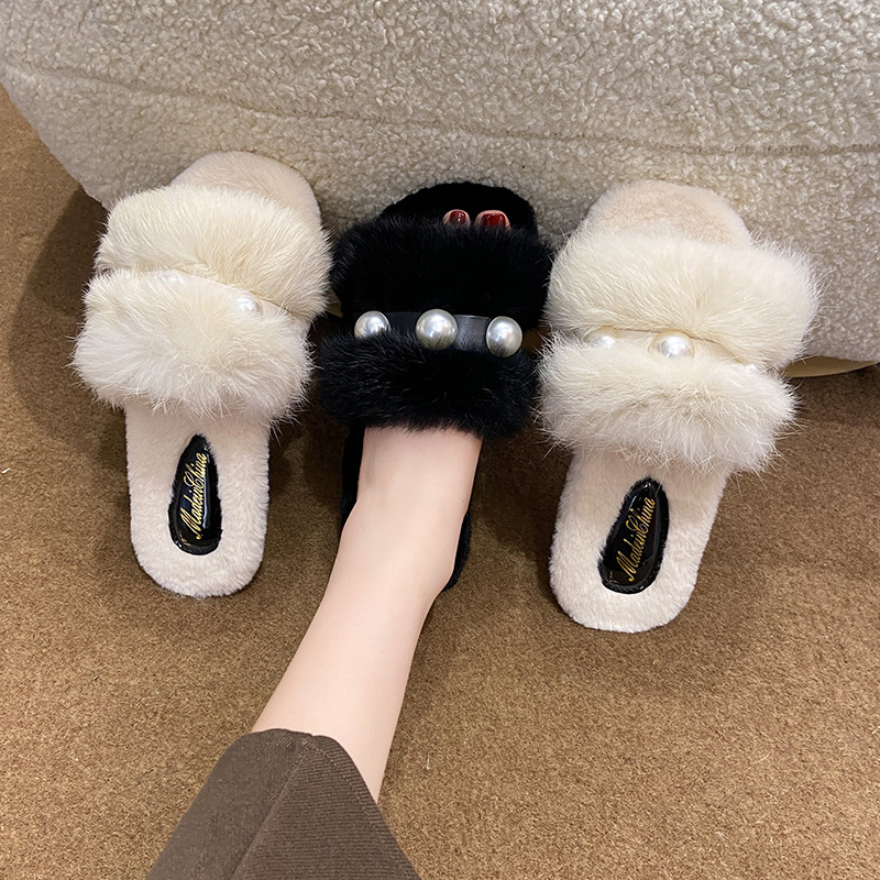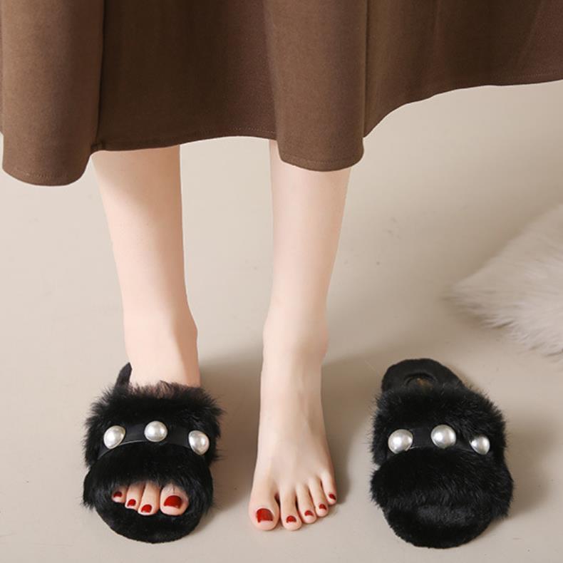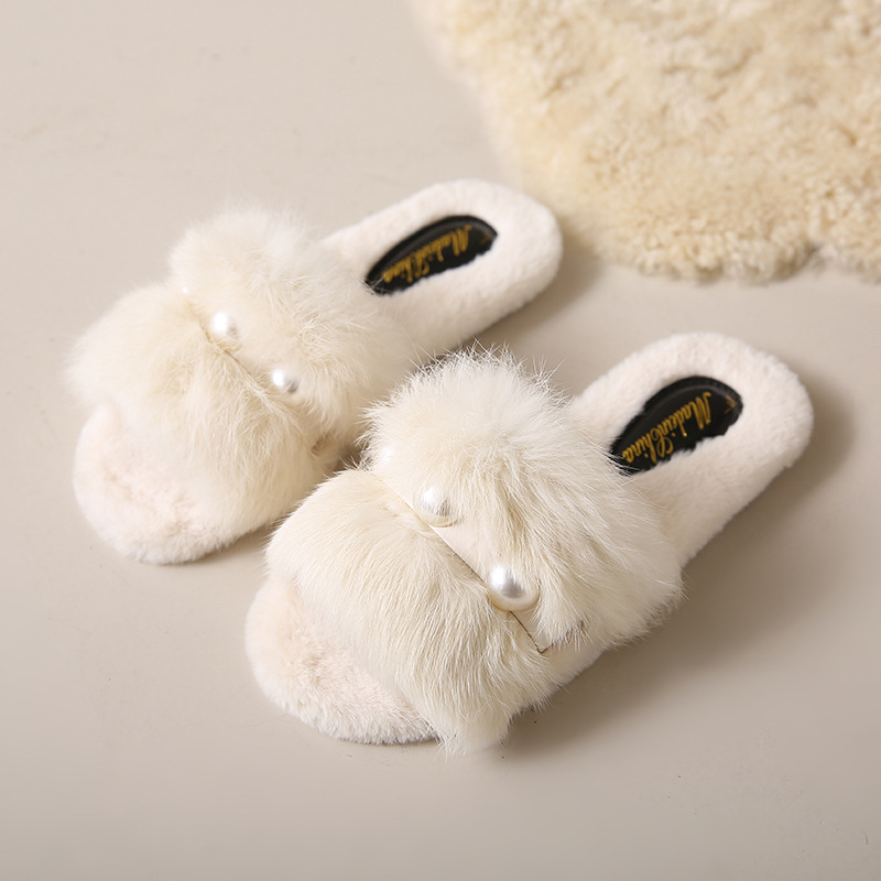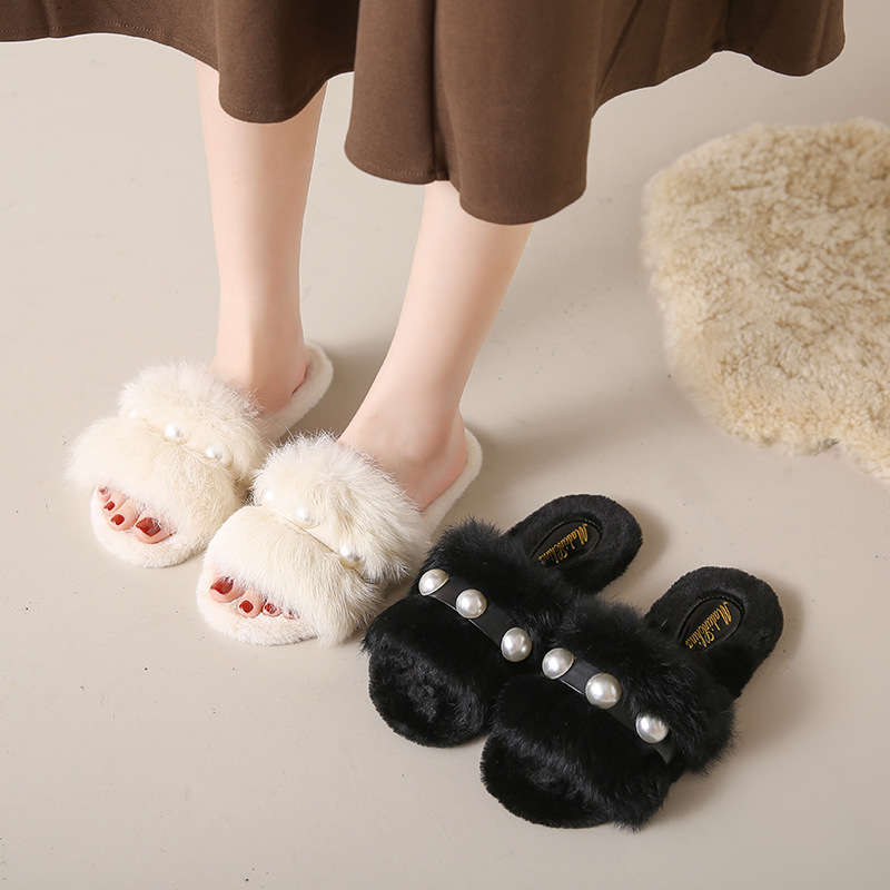 2023 hot selling Elegant ladies fashion fluffy indoor slippers Casual pearl solid flat slippers white shoes for men
